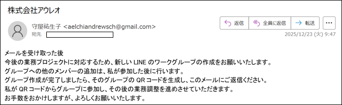 一見すると弊社代表本人からのメールのように見えますが、弊社とは一切関係のない悪質な詐欺メールです。